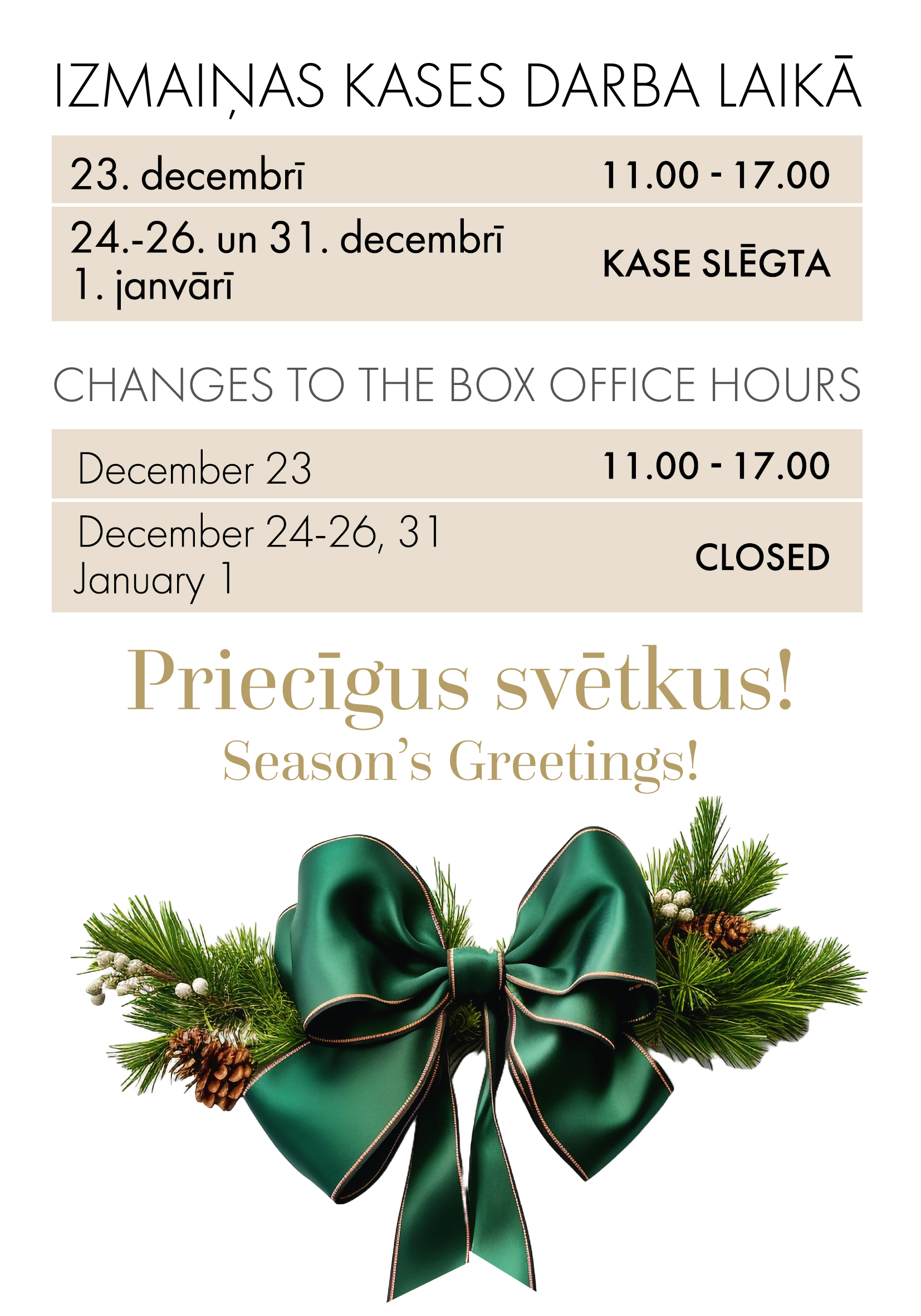The Box Office working hours during holidays