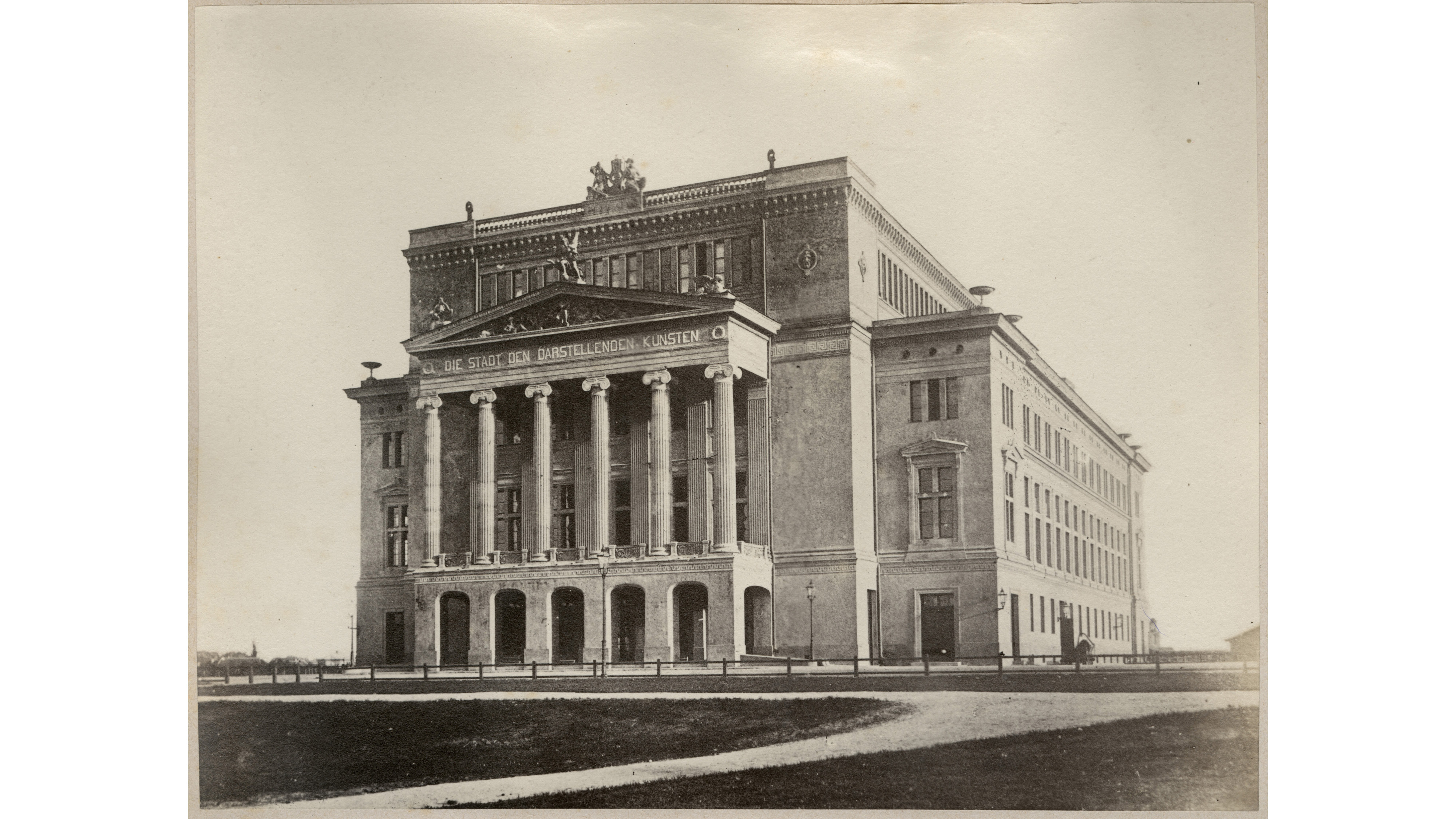 Ideja par teātri kā mākslu templi pārliecinoši īstenota Sanktpēterburgas vācu arhitekta Ludviga Bonšteta [Ludwig Bohnstedt, 1822-1885] 1860. gada projektā Rīgas Pilsētas teātra ēkai, kura tika pabeigta 1863. gadā. Kopš 1919. gada šajā namā strādā Latvijas Nacionālās operas un baleta trupa. Klasiskās formās veidoto nama fasādi iezīmē sešas joniskas kolonnas, virs kurām vairākos līmeņos rezidē gan dievišķais Apollons ar svītu, gan mežonīgo panteru-fantāziju savaldošais Mākslas ģēnijs ar grieķu teātra masku rokās. Atiku rotā Apollona liru sargājošā Talija/Komēdijas mūza, kā arī Melpomene/Traģēdijas mūza.