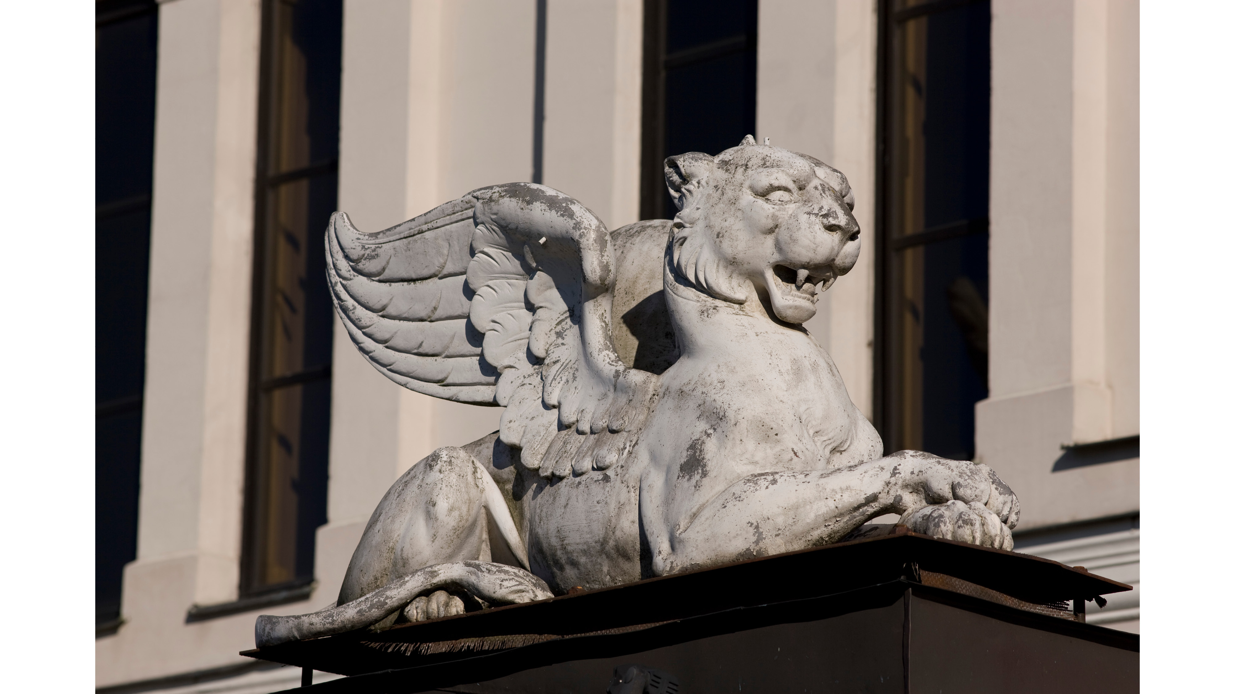 Hermaņa Vitiga veidojums ir arī jau Ludviga Bonšteta skicē redzamais frontona akrotērijs, gan Austrumu, gan arī Rietumu pamali vērojošais SPĀRNOTAIS SARGS ar visai neskaidru sugas piederību: lauvas ķermenim šeit burtiski pievienots Ģēnija savaldītās mežonīgās fantāzijas-panteras noģīmis.